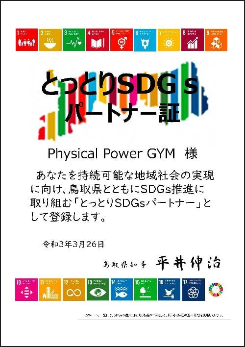 PhysicalPowerGYMは、「とっとりSDGsパートナー」に登録されました。今後も、当ジムを通じてSDGsの達成を目指して参ります。